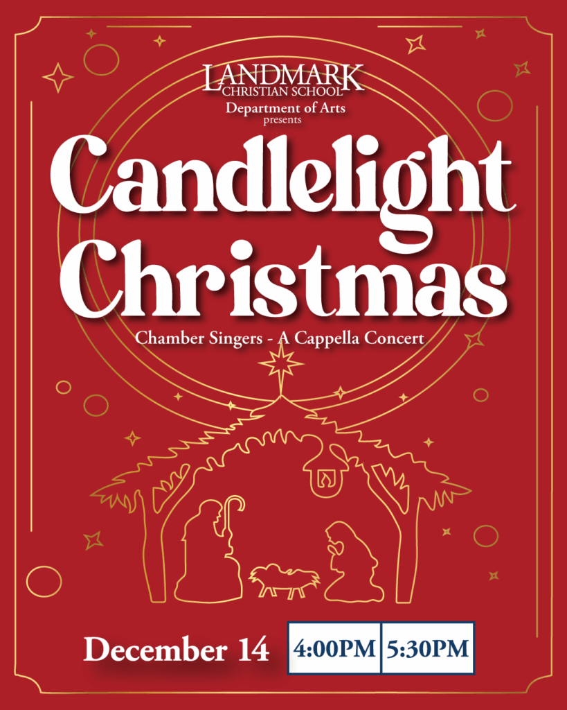 The Landmark Chamber Singers are excited to present their one-of-a-kind, biennial Candlelight Christmas event. As the lights dim and the candles flicker, the Chamber Singers take the Black Box stage and fill the air with the harmonious melodies of beautiful a cappella Christmas music.